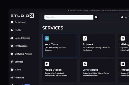 Studio X connects music creators with a wide range of service providers, including audio engineers, producers, VFX artists, videographers, photographers, and graphic designers. Additionally, creators can get song placements, distribute their music to all major platforms, sell releases directly to fans, and access comprehensive analytics.